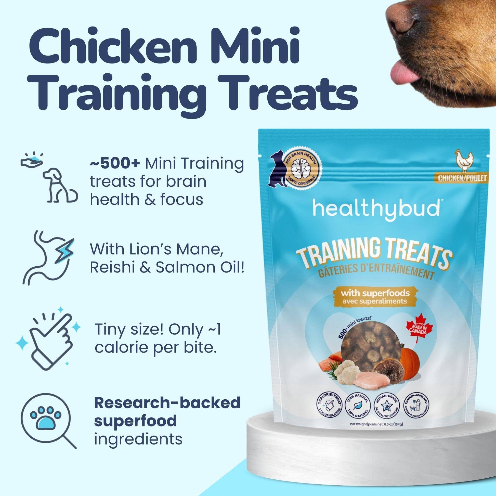 Discover Healthybud’s newest Beef Mini Training Treats for brain health. These unique, low-calorie treats are packed with superfoods like Lion's Mane, Reishi, and Salmon Oil to support brain health while delivering delicious taste and nutrition in every bite.